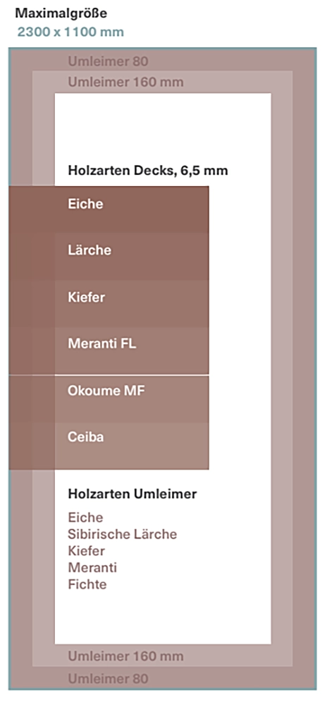 CLIMAPORTA door blanks can be supplied to order in freely selectable sizes and all standard plywood surfaces. Maximum size 2300×1100 mm.