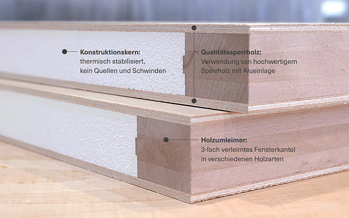 Any moisture that has penetrated, for example in the window or lock, dries out without causing damage. The door blank has the best thermal insulation without thermal bridges. This means: no condensation in the area of the glazing beads.