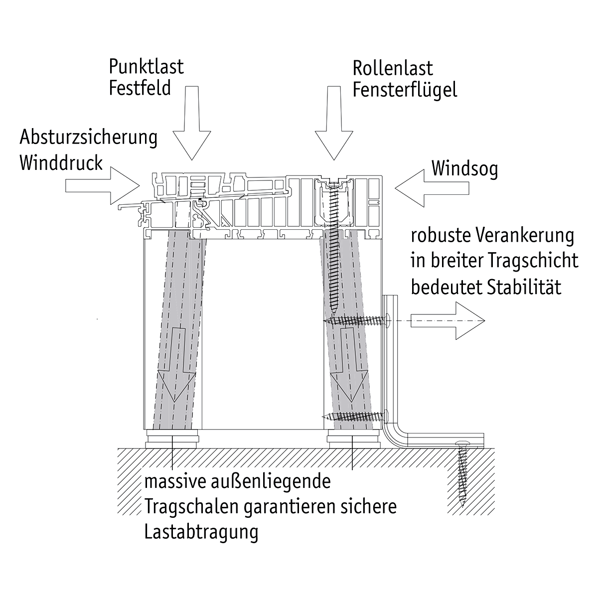 The lift and slide substructure combines strength and excellent thermal insulation thanks to two load-bearing layers and an insulating core with a very low dead weight. Thanks to the two thick load-bearing layers on the inside and outside, screw connections can be made from above and below without any problems. The forces are thus easily transferred into the masonry.