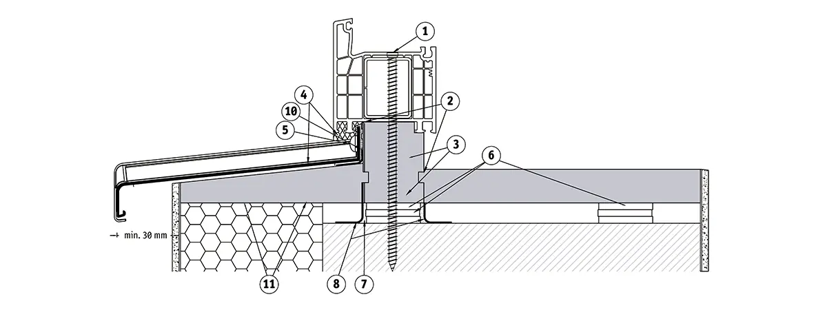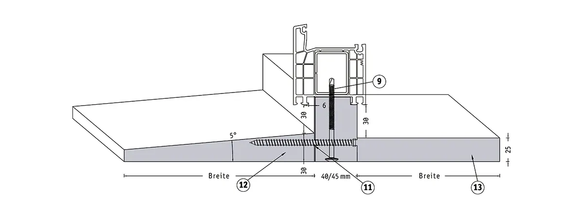 - Window frame screw 7.5 mm – no pre-drilling required in the window sill connection profile; spacing and anchoring length according to static requirements or RAL guideline